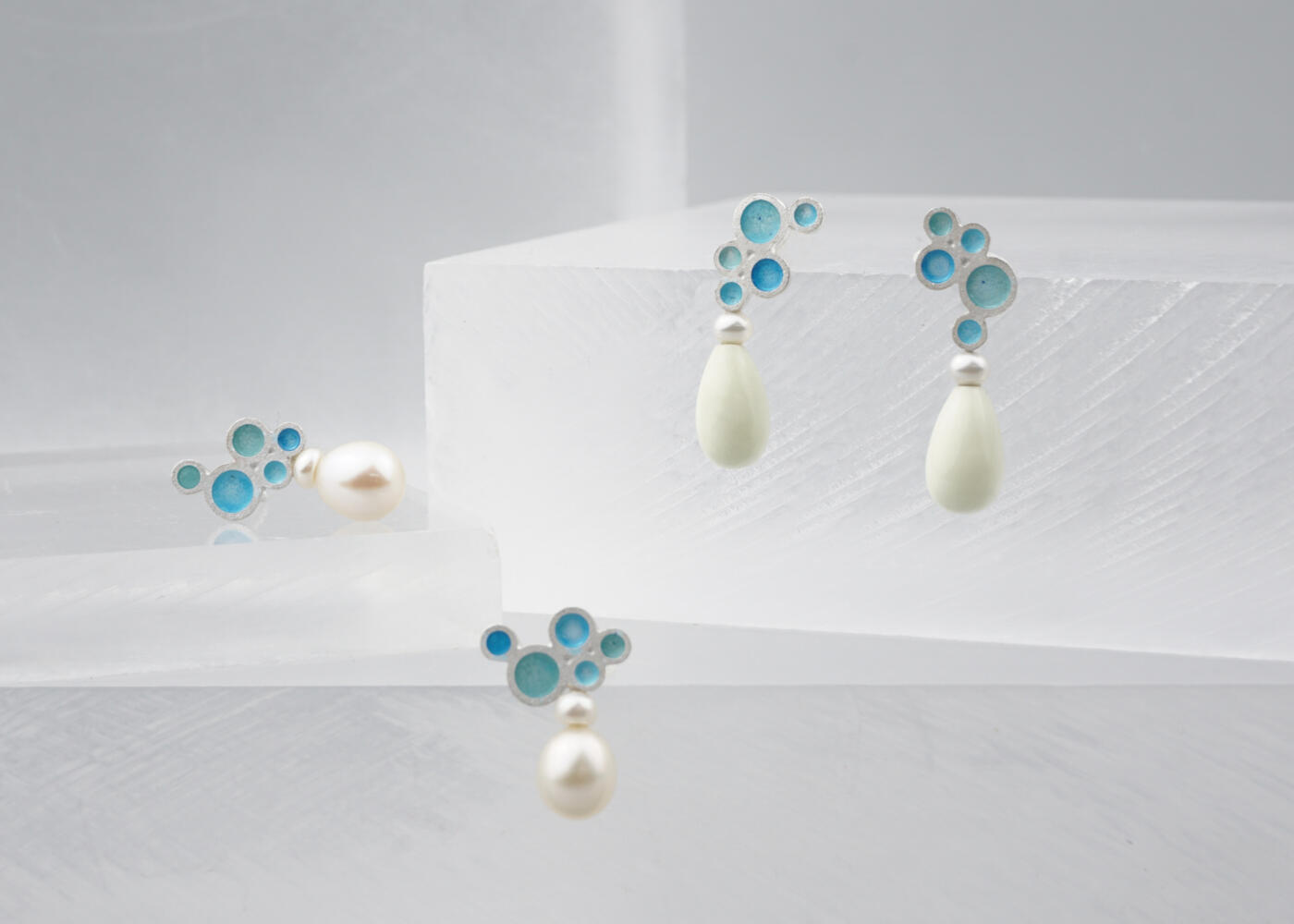 Ich verwende wegen seiner Farbe und seiner hohen Verträglichkeit hauptsächlich Sterlingsilber. So entstehen leuchtende Farbmischungen, die eine hohe Brillianz haben. In Kombination mit echten Perlen oder Gelbgold ergibt sich eine wunderbare Partnerschaft, aber auch im Zusammenspiel mit geometrischen Formen bringt Emaille durch seine leuchtende Farbe ein spannendes Gegengewicht.